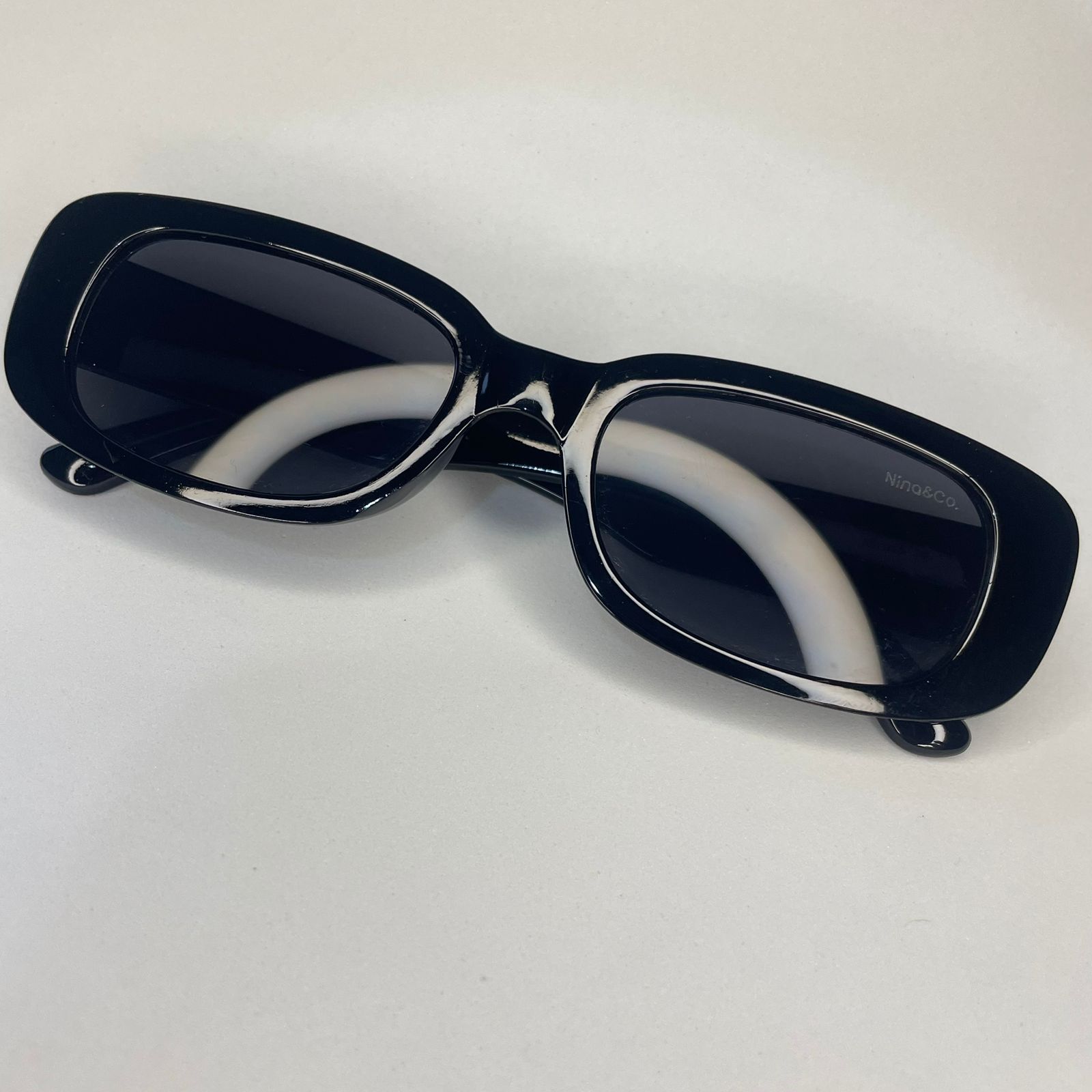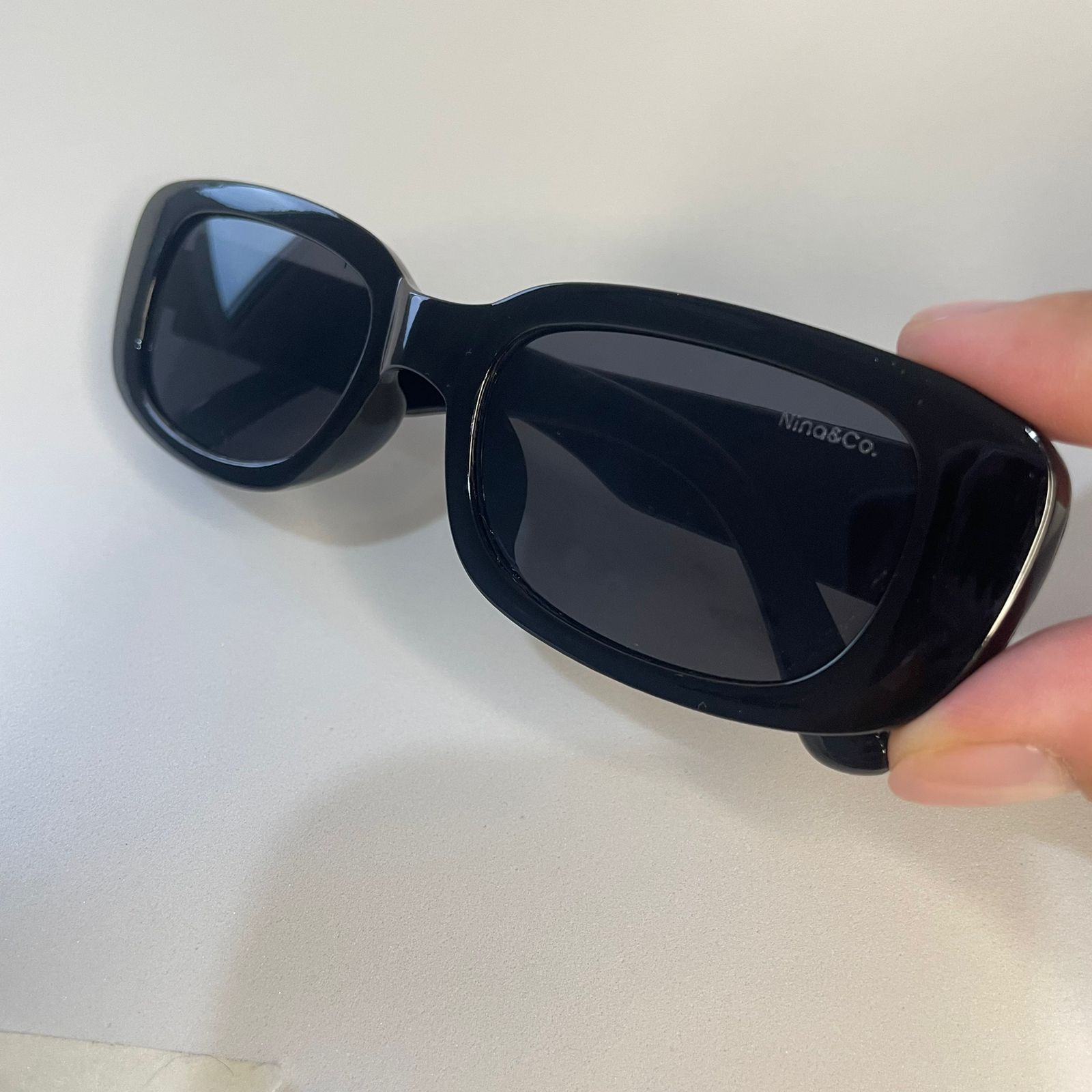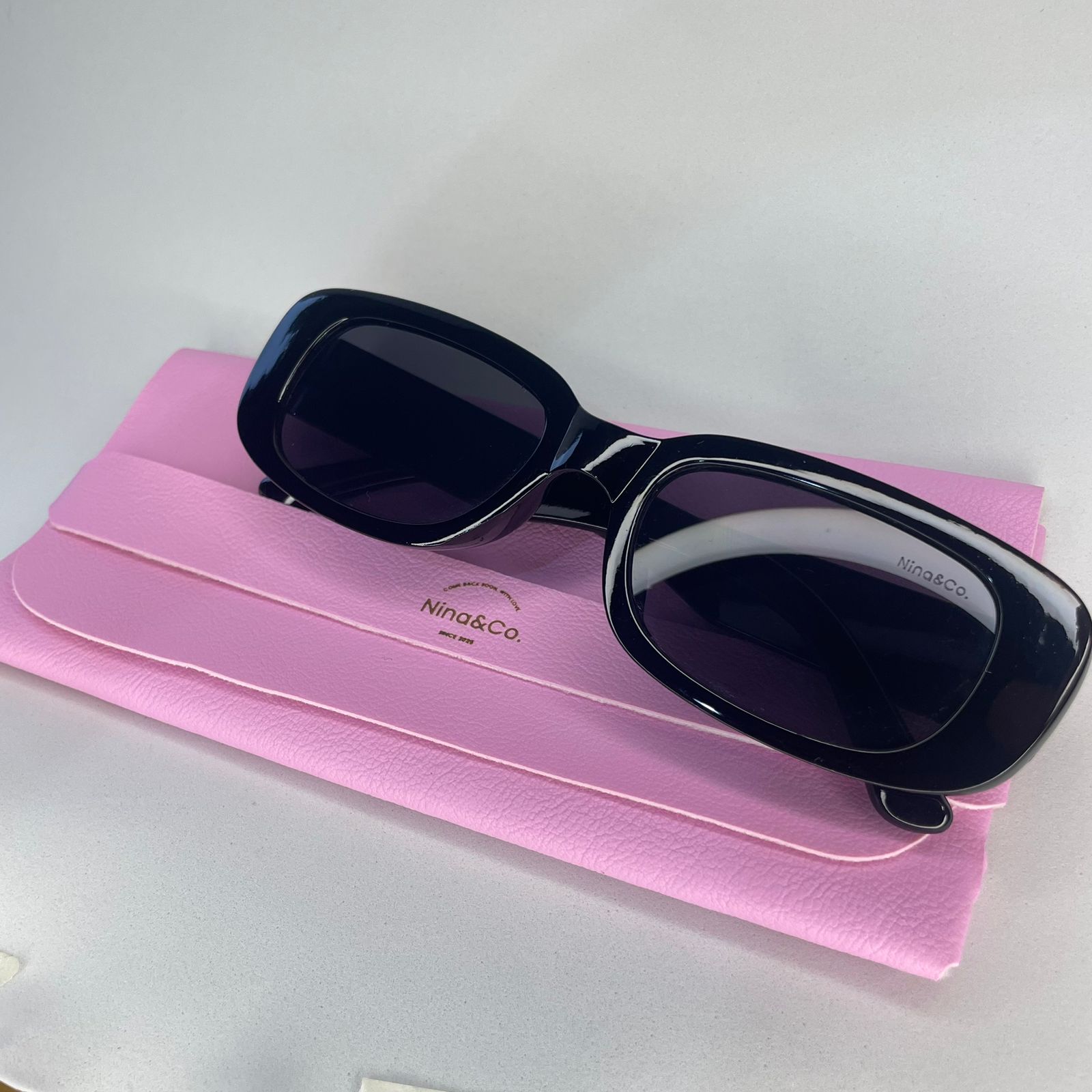 Todos os óculos Nina&Co. acompanham case de proteção e flanela para limpeza, além de possuírem proteção contra os raios solares UVA e UVB.